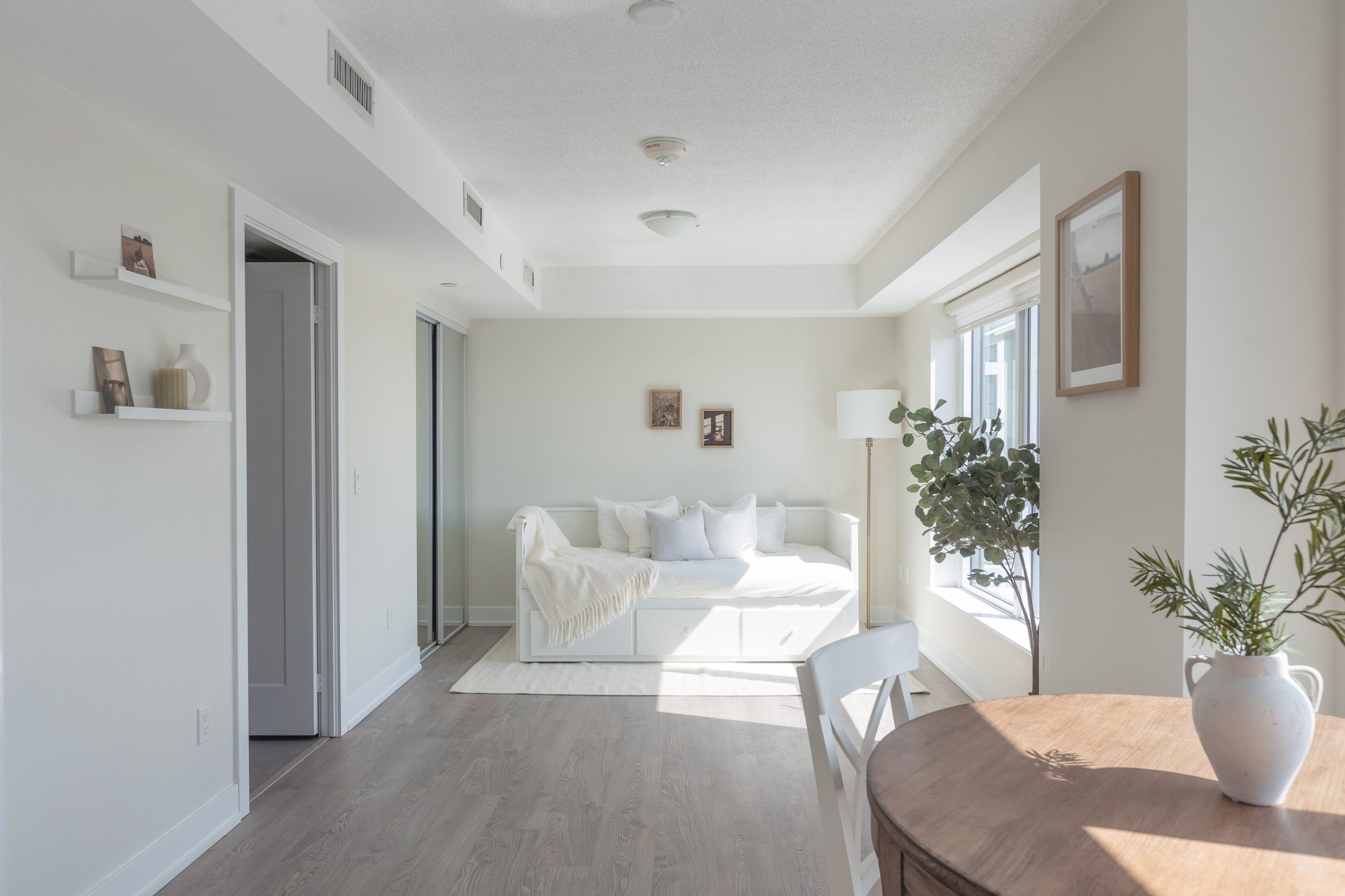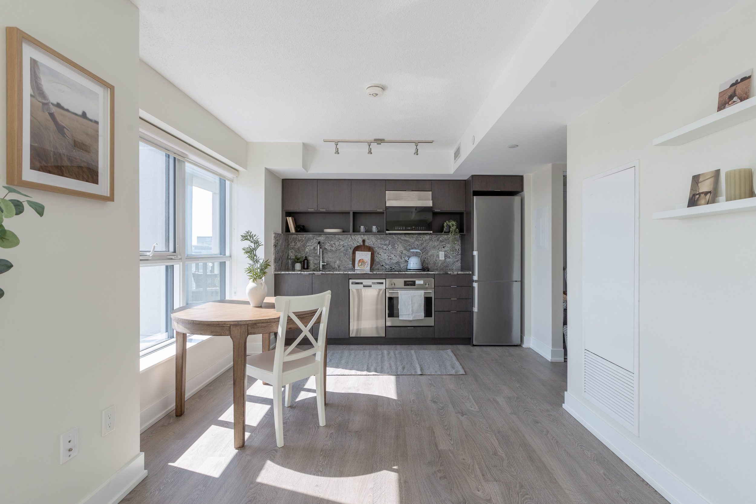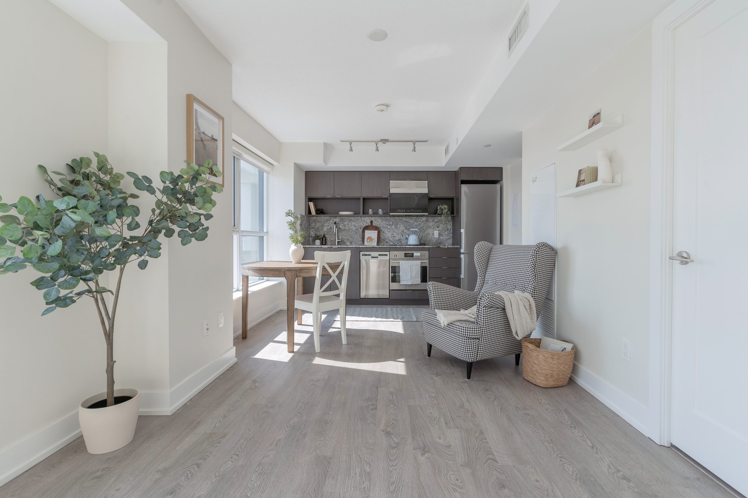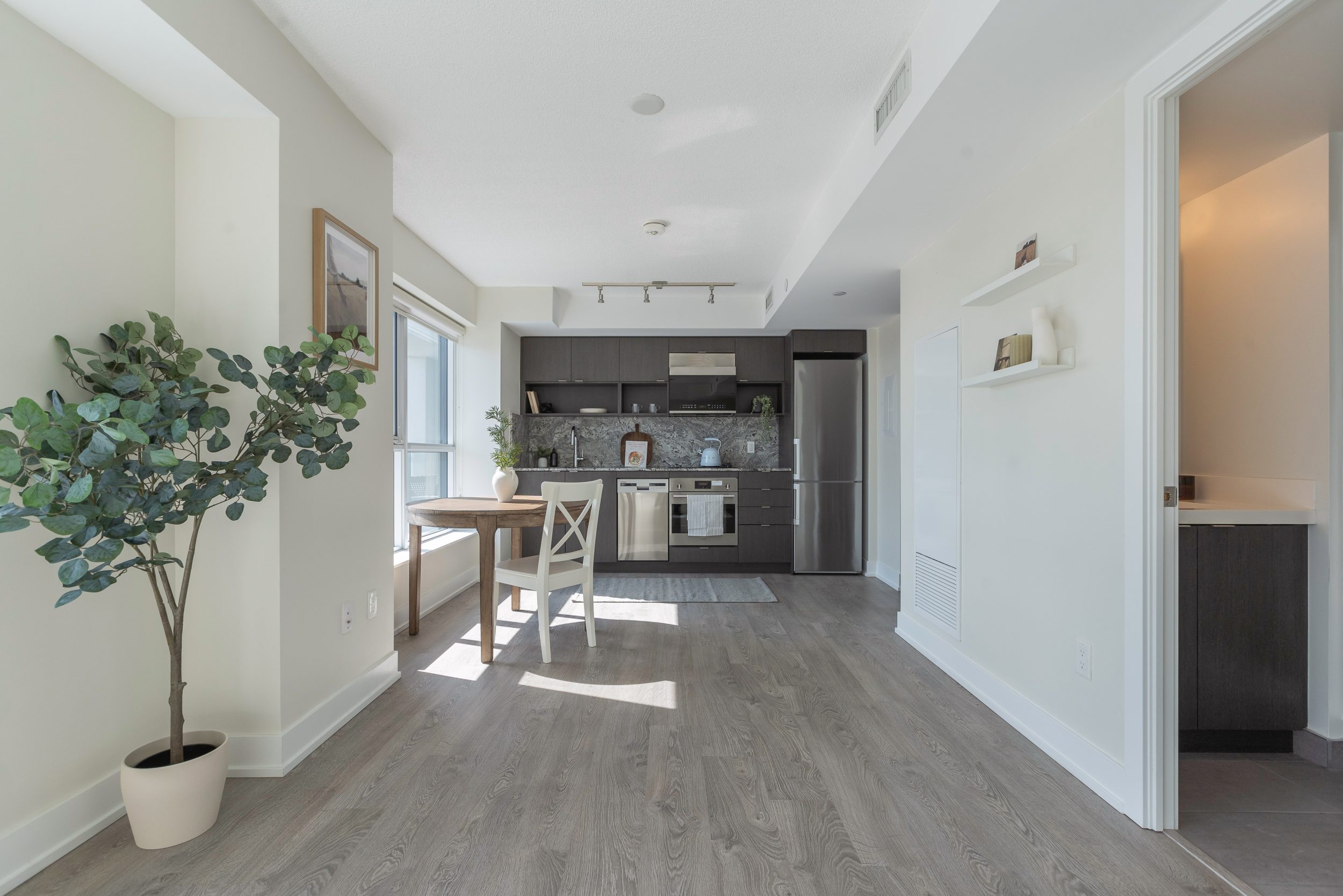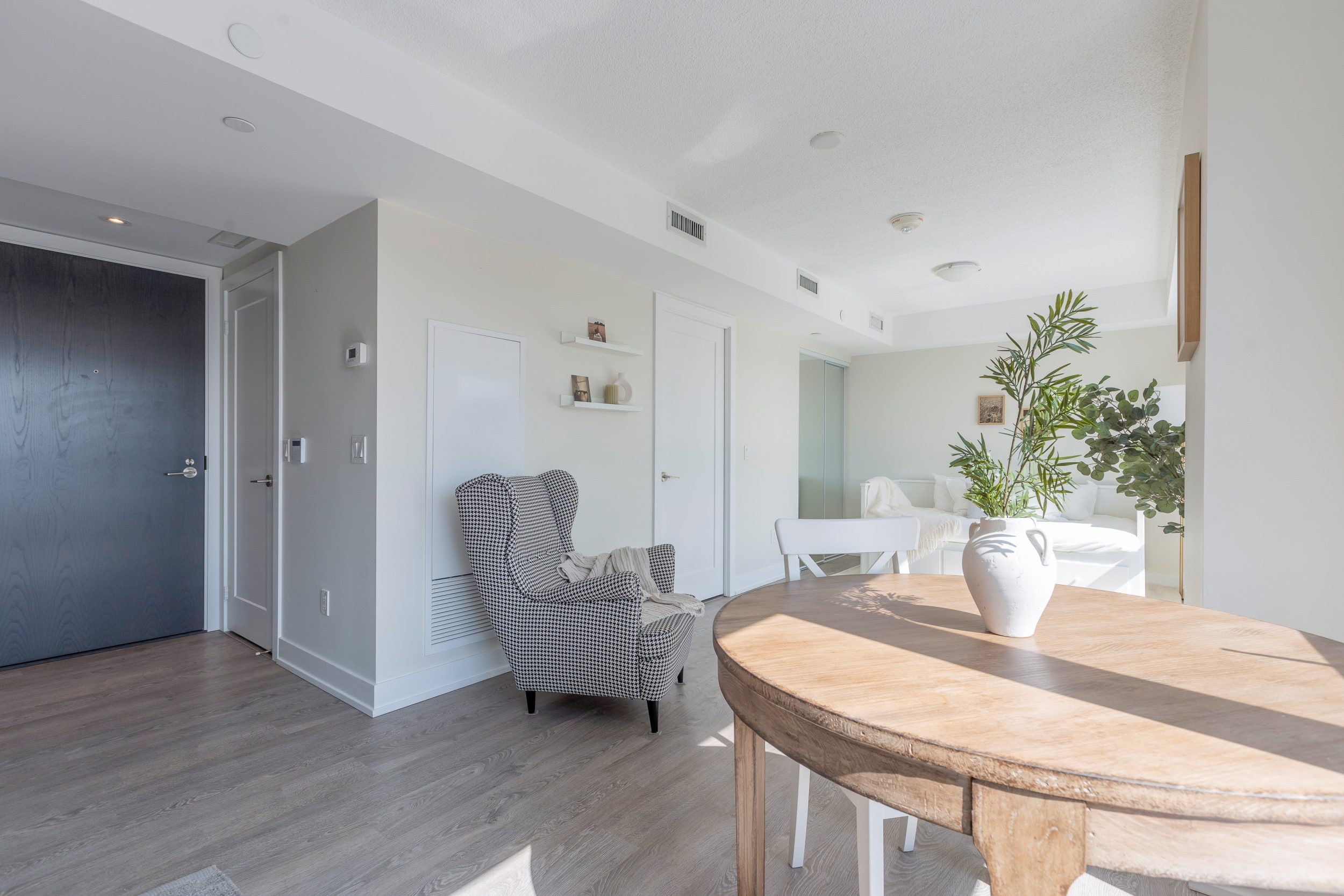 Welcome to BloorVista by Tridel. Suite 1423 is a rare find – a studio that’s spacious and functional to meet all needs. The smart south-facing layout is flooded with natural light from two oversized windows, framing lake views that make mornings a little brighter. Finishes include premium laminate floors, sleek cabinetry, granite counters, built-in appliances, and custom closet organizers that maximize storage. A locker is also included, so everything has its place. The resort-inspired amenities check every box: indoor pool, yoga studios, full fitness centre, basketball court, party lounge, games room, theatre, rooftop sundeck with BBQs, concierge, bike storage, pet wash, and visitor parking. Steps to Islington subway, with quick access to the QEW/427/401, Sherway Gardens, local shops, parks, and trails. Downtown in 20 minutes. One storage locker included.