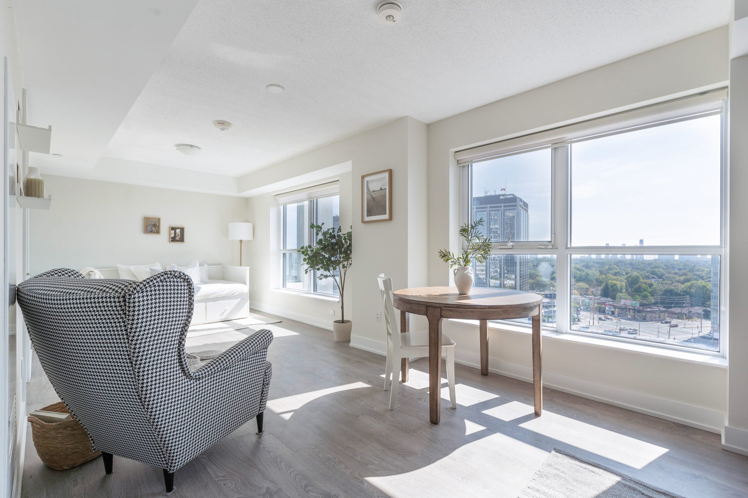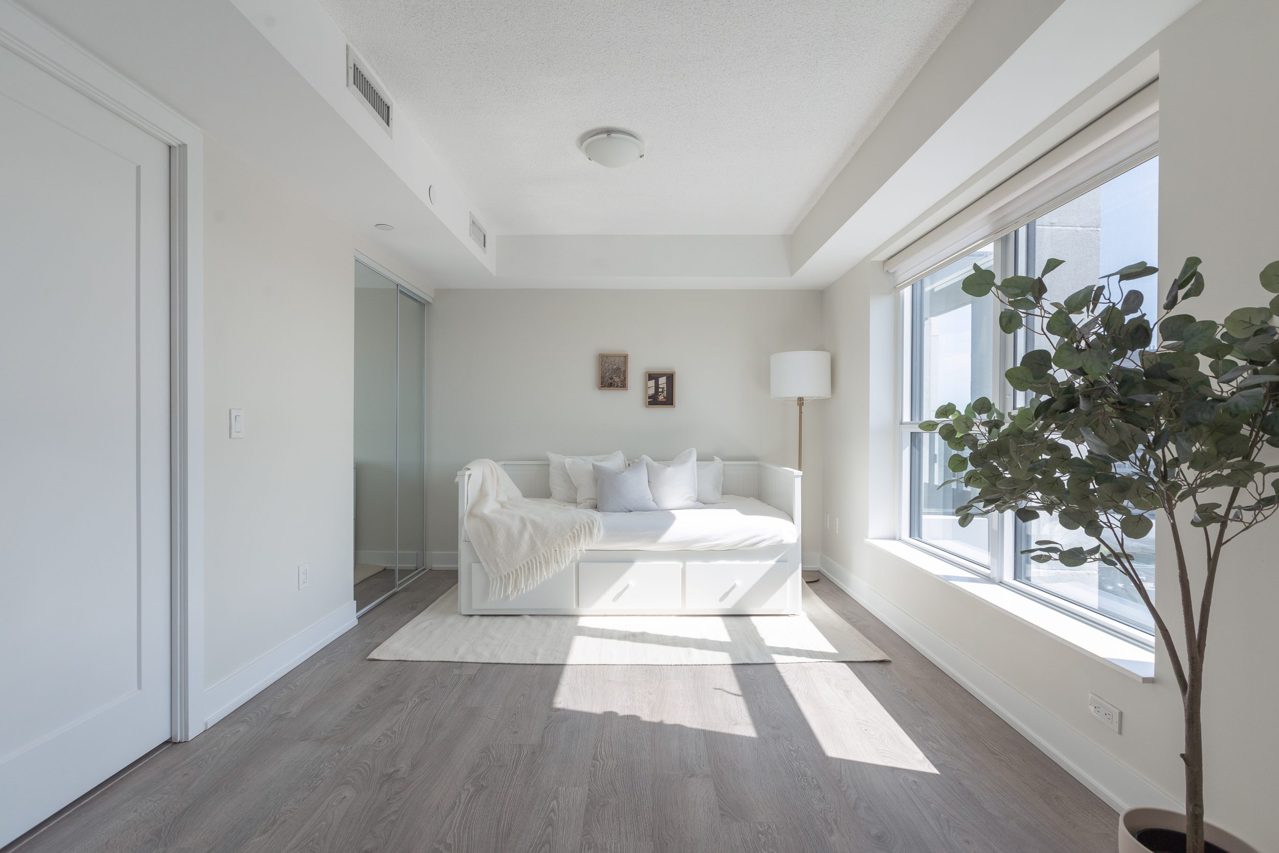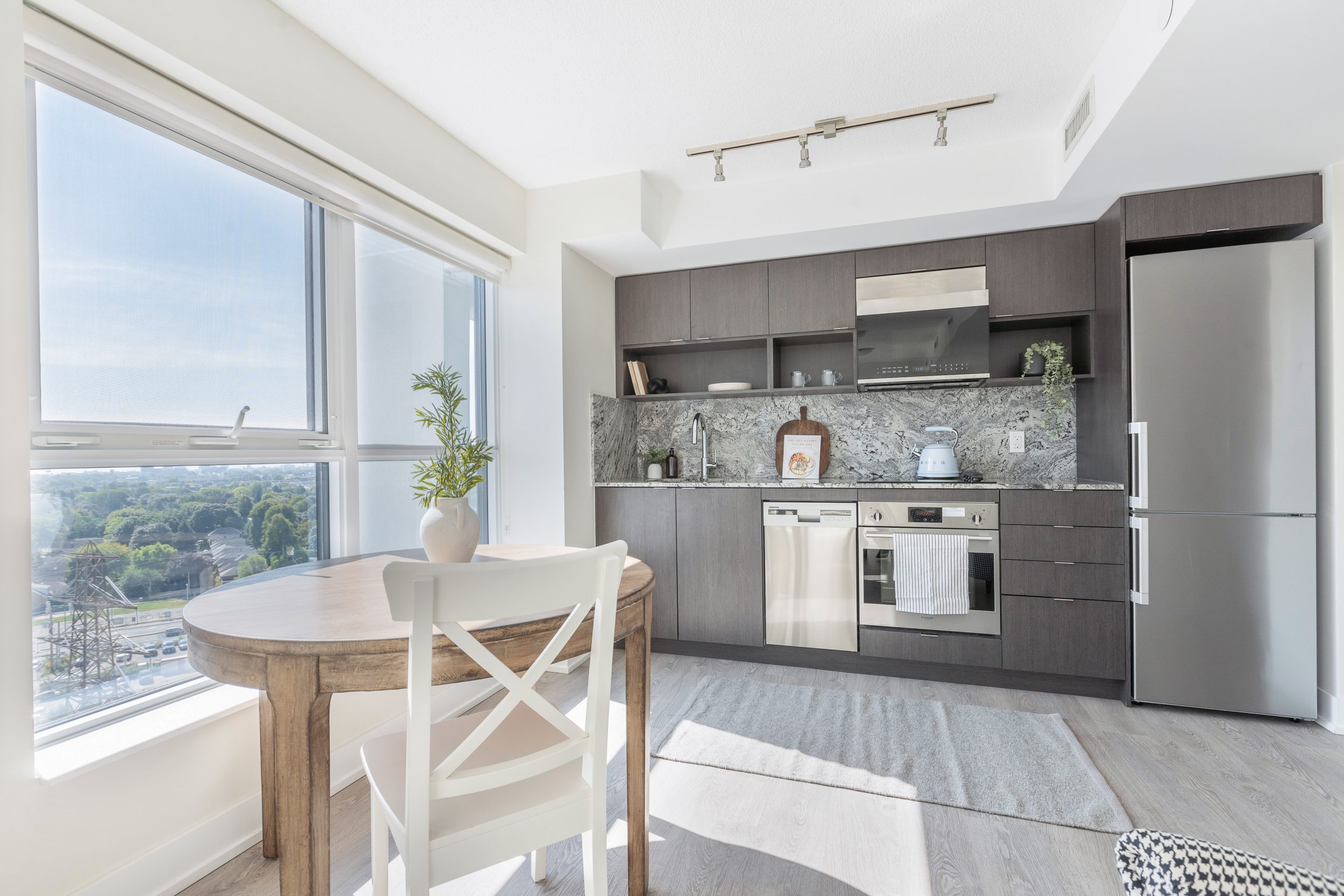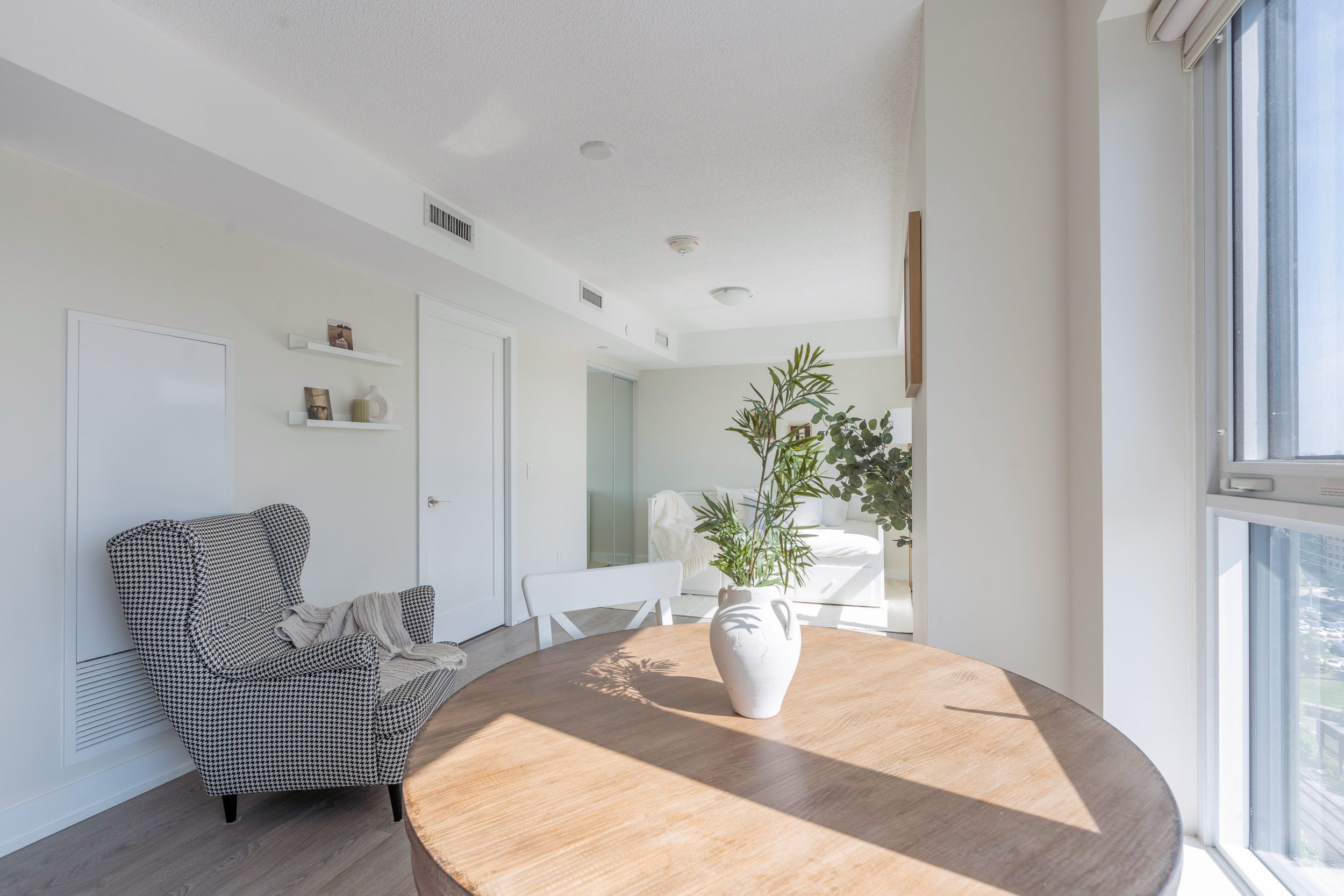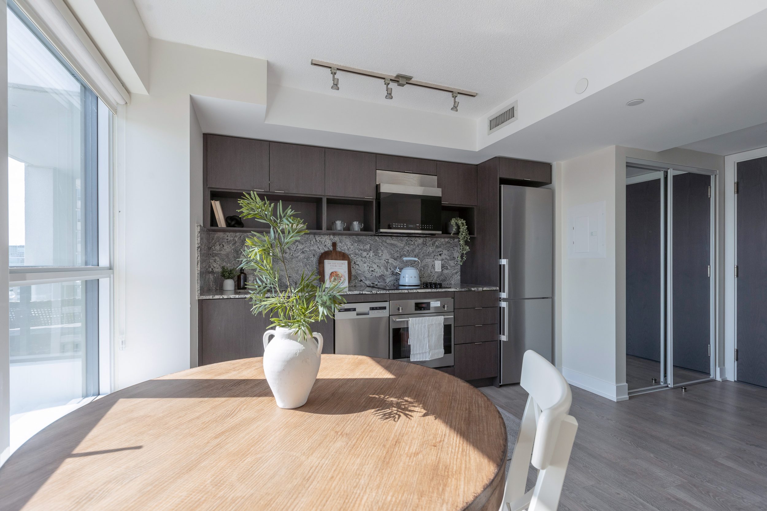 Welcome to BloorVista by Tridel. Suite 1423 is a rare find – a studio that’s spacious and functional to meet all needs. The smart south-facing layout is flooded with natural light from two oversized windows, framing lake views that make mornings a little brighter. Finishes include premium laminate floors, sleek cabinetry, granite counters, built-in appliances, and custom closet organizers that maximize storage. A locker is also included, so everything has its place. The resort-inspired amenities check every box: indoor pool, yoga studios, full fitness centre, basketball court, party lounge, games room, theatre, rooftop sundeck with BBQs, concierge, bike storage, pet wash, and visitor parking. Steps to Islington subway, with quick access to the QEW/427/401, Sherway Gardens, local shops, parks, and trails. Downtown in 20 minutes. One storage locker included.